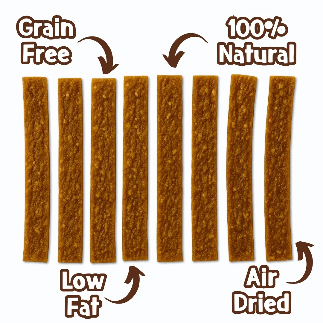 Luchtgedroogde strips van heerlijke taaie lekkernijen! Ons plantaardige recept is graanvrij, zonder runderhuid en vetarm. De ultieme lang houdbare traktatie!